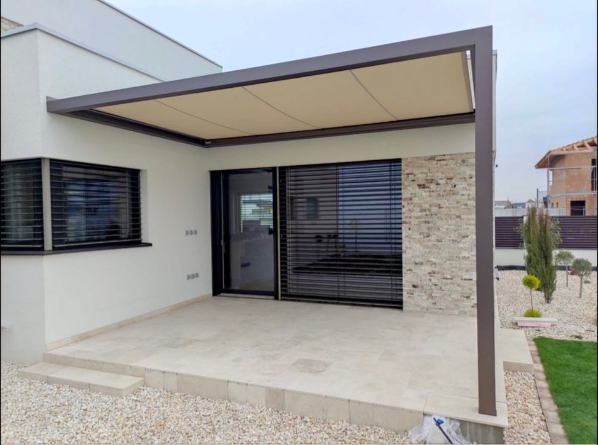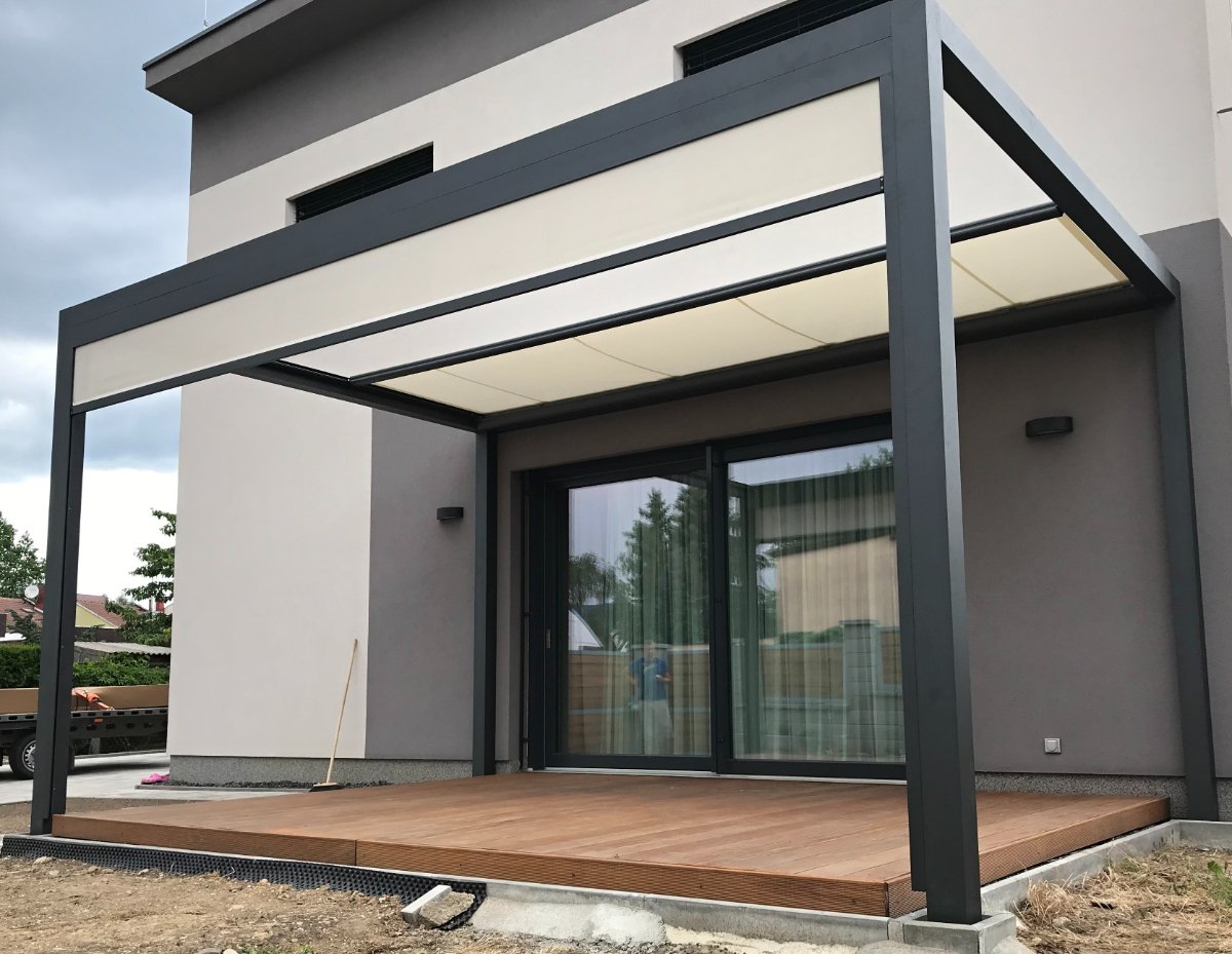 Všechny stěny pergoly je možné dovybavit screenovými roletami na dálkové ovládání, posuvným bezrámovým zasklením nebo slunolamem.